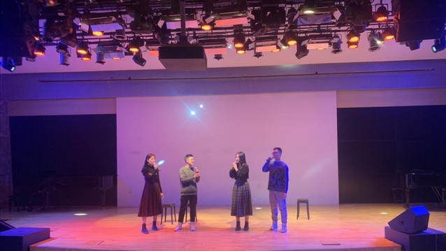 12月18日,我院王玲、魏佳、吴文轩、刘宇航四名同学于人文与艺术学院报告厅成功完成《修炼爱情》歌曲演唱节目的录制,标志着此次艺术实践校园行活动圆满结束。