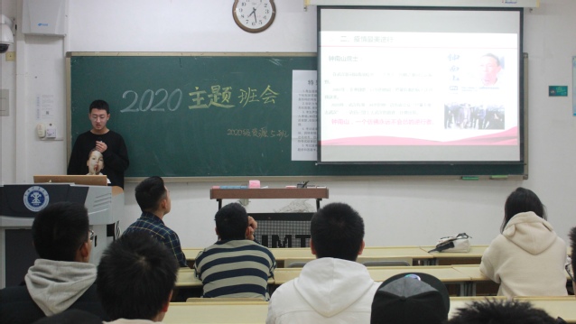 会议伊始,团支书苏敬博通过最新的数据就国内外疫情形势做了简单的阐述,肯定了我国在疫情上取得的一系列成就,并总结了我国疫情防控的制度优势及在全球疫情下的大国担当。与此同时他提醒同学们虽然疫情形势向好,但尚为复杂严峻,千万不要松懈个人的防护。随后,团支书苏敬博以ppt轮播的方式讲述带领同学们重温抗疫过程中感人的英雄故事,他说:“这些才应该是我们青年的偶像,而不是荧幕上的小鲜肉们”,倡导同学们培养自己的人文关怀,更多地关注疫情新闻,而非娱乐新闻。紧接着一段热血沸腾的视频带同学们回到了二零二零年的初始,视频中是临危请命的白衣天使在抗疫前线的输死搏杀、是最美“逆行者”们迎难而上的身影、是疫情期间令人揪心的新闻片段……荧幕上,一个个名字和身影汇成暗淡疫情中温暖和力量触动着在场的所有人,同学们纷纷发言,分享发生在自己身边的抗疫故事。最后,团支书苏敬博带领同学们用青春告白祖国:致敬英雄,牢记担当,共抗疫情,爱国力行!就这样在激情的宣誓中结束了班会。