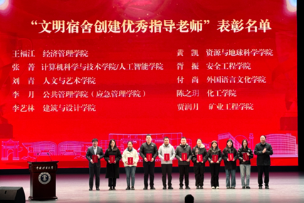 在本次表彰中,我院获评“文明宿舍创建先进单位”,杏2楼B3102宿舍获评“文明宿舍创建标兵宿舍”,辅导员黄凯获评“文明宿舍创建优秀指导老师”,董亚朝同学获评“文明宿舍创建优秀宿舍长”。