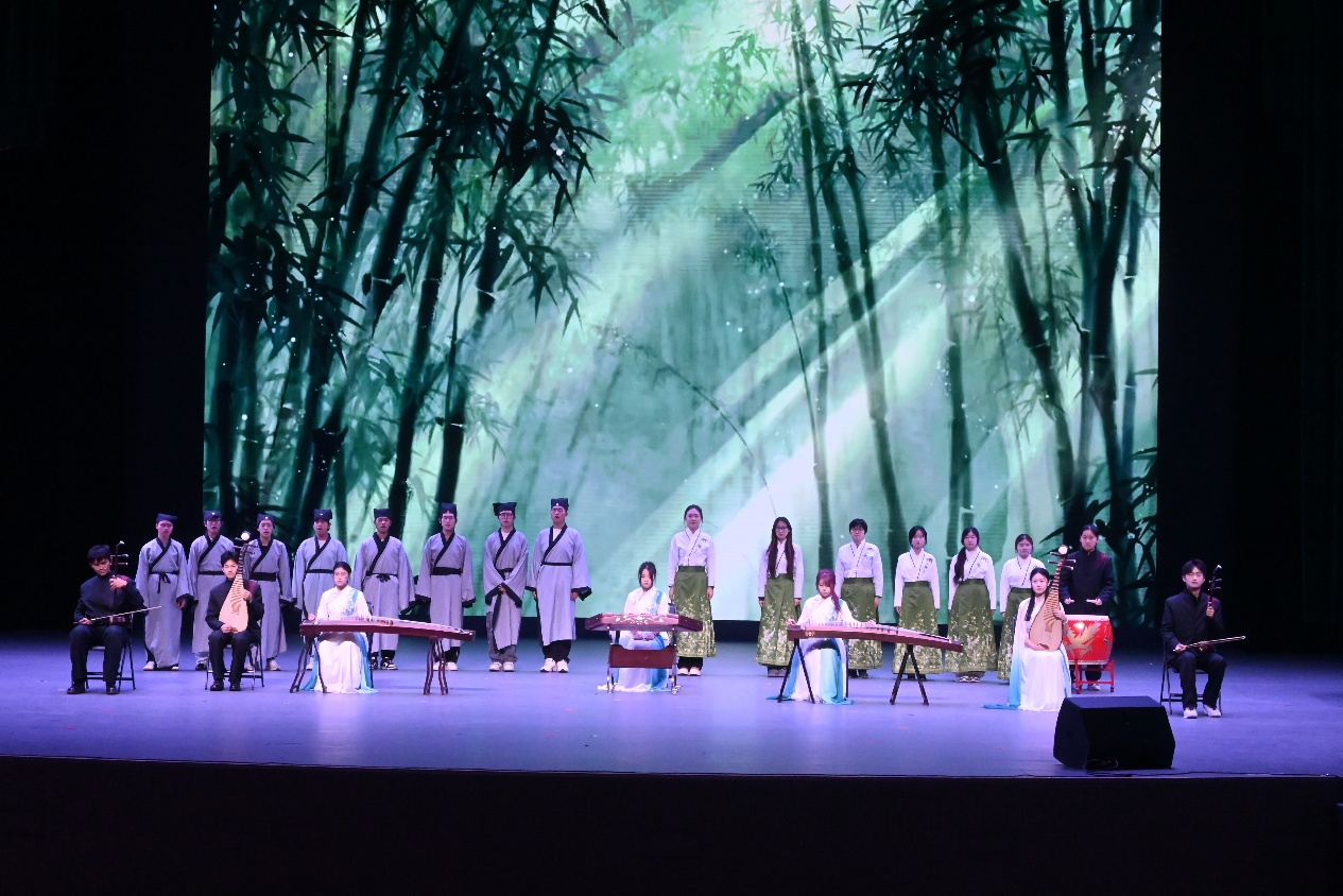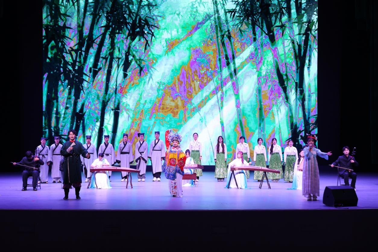 此次活动邀请人文与艺术学院学生指导,21个学院共同参演。我院选送节目《定风波·莫听穿林打叶声》以一场穿越千年的古今对话为主线,深情演绎苏轼名作,致敬其背后旷达洒脱的东坡精神。同学们在与从容豪迈的“苏轼”对话中,体味其宠辱不惊的人生态度。演出将千年传诵的词章,通过扬琴、古筝、琵琶、二胡、鼓等传统乐器婉转呈现,旋律起伏有致,意境深远绵长。尾声处,身着戏服的同学以一段悠扬戏腔将全场推向高潮,将苏轼“何妨吟啸且徐行”的豁达从容展现得淋漓尽致,赢得评委与观众的热烈掌声。
