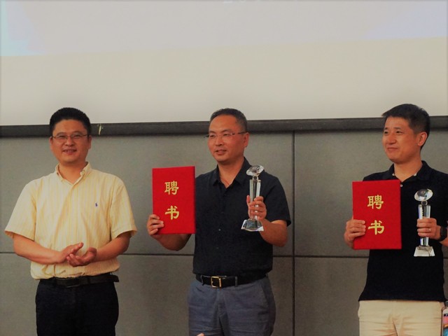 王伯平副书记向郑庆峰校友和毛德强校友颁发正式聘任书和奖杯