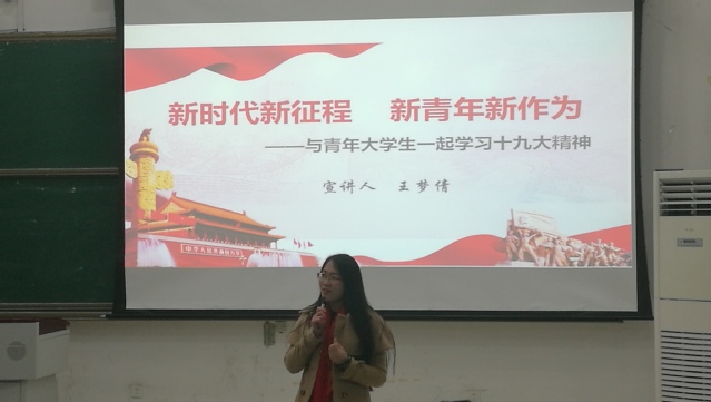 会上,王梦倩老师概要地讲述了党的十九大各部分内容,并以“不忘初心、继续前进”、“中国梦的含义”、“争做新时代的新青年”为重点,论述了青年一代的时代使命。王老师提出,要从党的十九大中看变化,要将自己的奋斗与国家发展紧紧联系在一起,勇做时代的弄潮儿。党的十九大报告中提到:“青年一代有理想、有本领、有担当,国家就有前途,民族就有希望。”对此,王梦倩老师通过对2016级学生的调查,结合同学们日常生活、学习中点点滴滴,告诫同学们能跟过去告别,做新时代的优质青年。同时,对2016级同学们提出五点要求:拥有中国情怀、具有世界眼光、坚定理想信念、勤于读书修身、乐于躬身实践。
