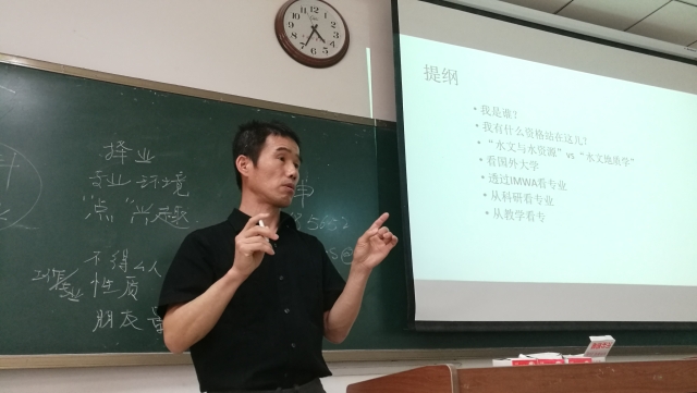 首先,王长申教授就同学们为什么选择水文专业这个问题谈起,解释了水文的具体专业概念及国内外水文专业的就业方向。随后,王长申教授由“我是谁?”、“我有什么资格站在这儿?”这两个问题,逐步地引出了本次交流会的主题。接着,王长申教授比较了水文与水资源和水文地质学的不同,从国外大学、IMWA、科研、教学四个方面,比较了国内外学习氛围的差距,告诉同学们应该怎样学习、怎样才能学好。他指出,同学们在大学阶段要建立正确的思维,要“多学科,跨专业”学习。最后,王长申教授通过一系列图片,与同学们分享了他海外访学的经历与感触。