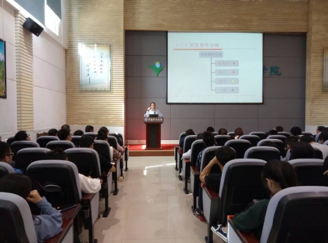 吴尔松主任首先发言,他对突发事件进行了举例和概述,定义了危险突发事件的等级,阐述了突发事件的特点,并以徐州市的自然灾害情况为例,指出了安全形势严峻以及应急管理不到位的现象。最后,吴主任详细讲解了突发事件的处理原则和流程,以发生在徐州市的典型突发事件为例,使大家认识到抓住细节降低安全隐患,提高应对突发事件能力的重要性。