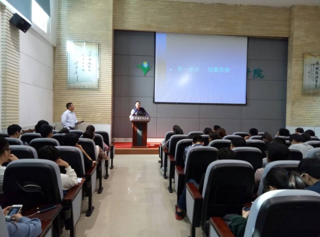 祁玉岭局长第二个发言,祁局长采用了问答的形式开始了报告,使得现场的氛围更加活跃。第一位提问的是一名机电学院的博士生,祁局长在回答了学生的问题之后,指出了如今地震活动明显增强的现象,肯定了学生对于地震应急设备和地震预防方面的思考。随后祁局长讲述了徐州地震局的预测标准和工作规范,同时结合另外几位同学的问题,谈到了地震趋势的预测和研究以及在工程建设中所要考虑的问题。最后,祁局长提出了自己的看法:地震并不可怕,它离我们遥远又现实。