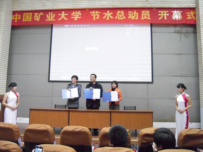 仪式首先由一段简短的视频开场,视频中显现的是近年来我国面临的日趋严峻的水资源短缺问题,危及到我国国民的基本用水,节水活动势在必行。接着徐州市水利局水资源处节水科科长张潇向大家介绍了徐州市的水资源现状,他提出:徐州市是个水资源短缺的城市,并且缺水情况日趋严重,呼吁大家节约每一滴水,珍惜每一滴水,合理利用每一滴水,用实际行动珍爱生命之源。随后后勤集团昌湖物业经理陆瑞宏对我校大学生用水情况进行了阐述:我校大学生用水情况虽然都在用水标准之下,但男生用水明显高于女生,节水空间很大。主办方还以《水—生命的渴求》为题进行了声情并茂的朗诵表演,为大家介绍了甘肃民勤水资源短缺的严重形势。开幕式最后,徐州市水利局水资源处节水科科长张潇,昌湖物业经理陆瑞宏,资源学院团委书记张晓波老师共同签署了《节水总动员合作协议》,到场嘉宾在节水护水宣传幅上签字并对水资源保护送出了寄语。
