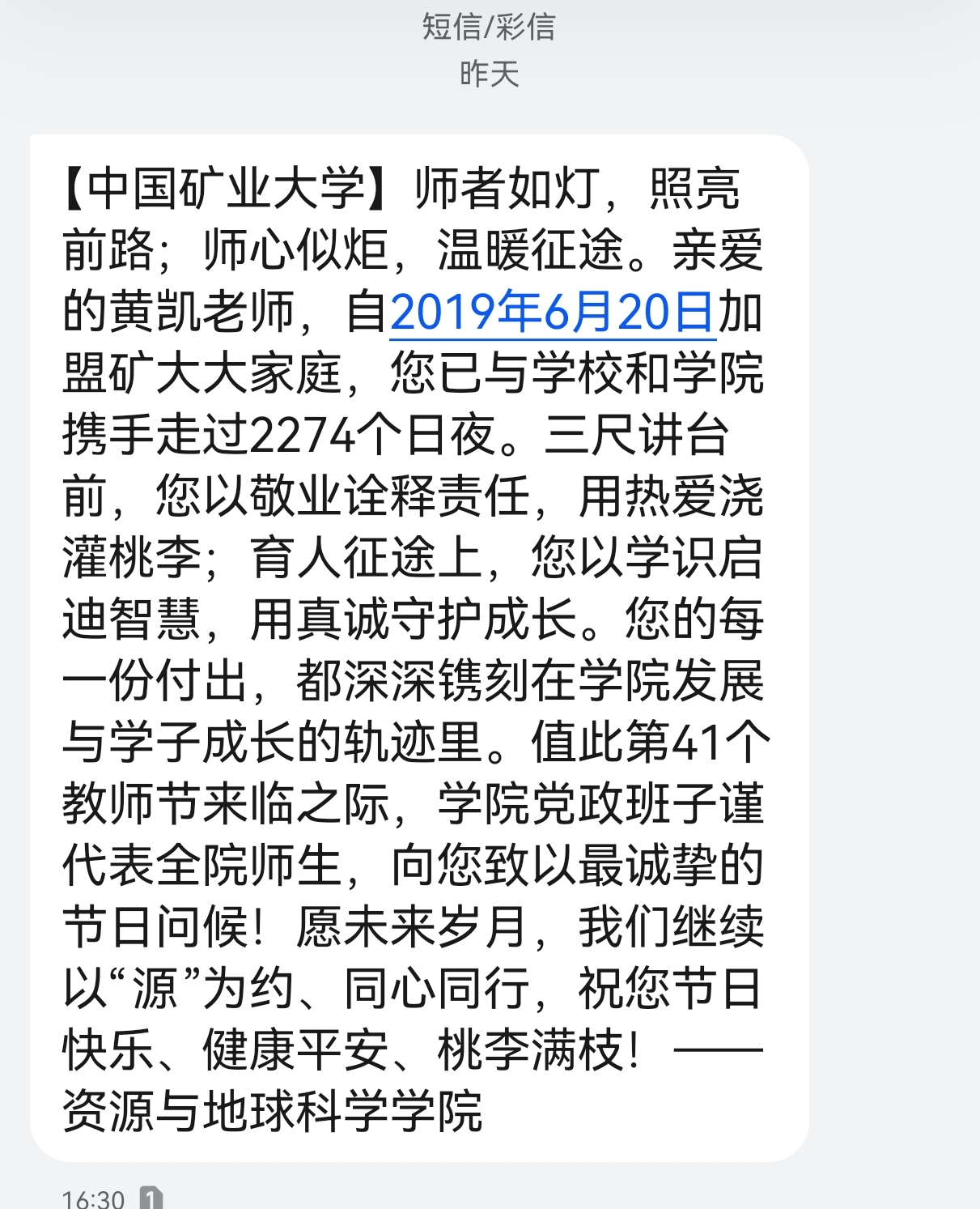 教师节当天,学院启动“暖心祝福传真情”专项行动,为全体教师发送定制化节日祝福语,简短话语承载满满心意,表达了对教师们辛勤工作、爱岗敬业的肯定与赞许,寄予了对教师们躬耕不辍、培根铸魂、奉献学院发展的感谢之情,祝福全体教师桃李芬芳、教泽绵长,初心如炬、使命如磐。