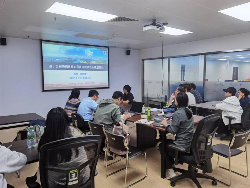 交流会上,参会人员分别就项目相关研究方向做了学术报告,并展开深入研讨。副院长朱奎教授线上参会并作报告《基于分解降雨数据的日径流预测混合模型研究》,该研究基于FSVMD-PE-MP和分解日降雨数据,研发了一种新的算法,具有新颖的数据去噪能力;徐智敏教授作报告《干旱半干旱露天矿区水资源立体储存与保护利用》,厘清了“四水”(降水、地下水、矿坑水、地表水)定量转化关系,基于“四水”资源供需与储用现状,提出五种矿坑水立体储存模式;陈歌副教授作报告《矿井水深贮目标层优选方法与增容机理研究》,揭示了矿井深部疏导贮水目标层控水规律及流场响应特征,阐明了不同回注模式下矿井深部异位疏导贮水层增容机制;张莉副教授作报告《矿井水回贮驱动下碳酸酐酶微生物对灰岩含水层介质的溶解-沉淀机制》,揭示了碳酸酐酶微生物-矿井水-回灌层介质耦合作用机理,构建了矿井水回灌驱动下碳酸酐酶微生物对灰岩目的层的溶解-沉淀概念模型;中山大学项目负责人林沛元教授作报告《工程资产管理统一框架及应用》,创新性地提出了统一框架M-IPT体系(Most ImPorTant),通过管理来提高效率,实现了健康表征指标、健康预测、韧性提升技术和运营管理耦合;高亮博士作报告《The impact of rising temperature on typhoon intensity and flooding in the Greater Bay Area》,阐明了气候变暖下海洋对台风强度的响应与反馈,数值模拟有效地再现了台风天鸽的结构和环流,完成了对深圳、香港等大湾区水浸过程进行精细时空定量模拟与预测。